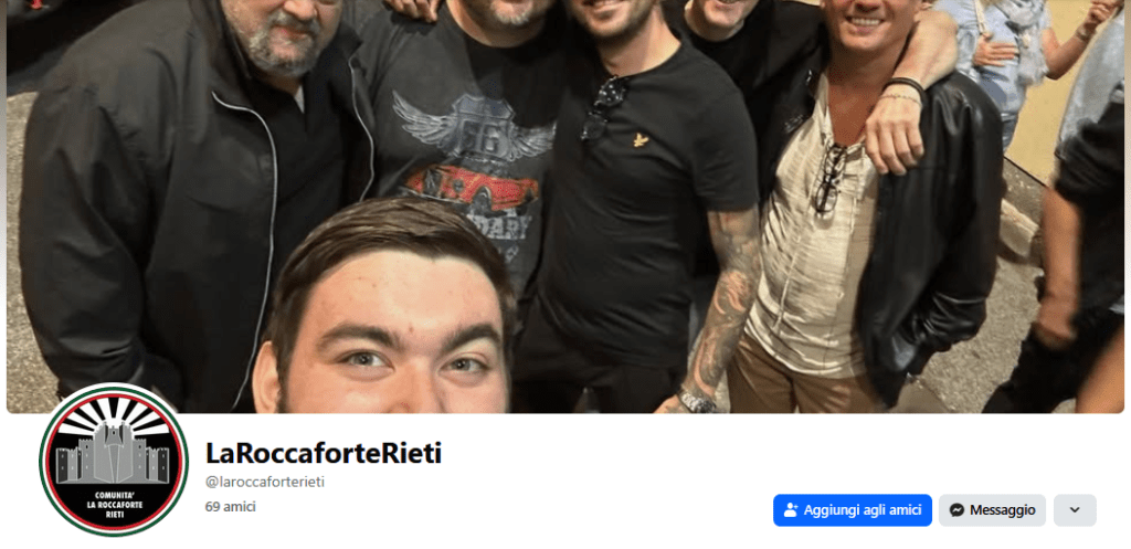 Tutti e tre gli arrestati fanno parte della comunità fascista reatina La Roccaforte. Il gruppo organizza rievocazioni fasciste e pubblica su Facebook periodici post che fanno apologia di fascismo. Oggi ha 69 amici ma ieri erano 71 e l’altro ieri 73. I fascisti si stanno cancellando. Uno degli amici è un carabiniere.