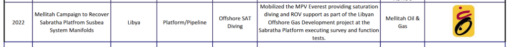 Lavora spesso alla Sabratha Platform in Libia per conto di Mellitah Oil & Gas (una joint venture tra ENI e NOC).