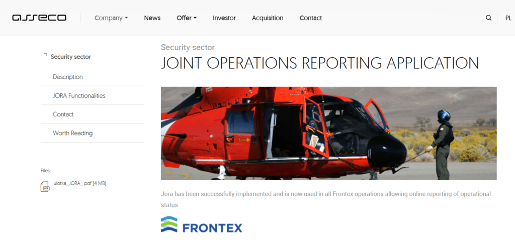 Se è così, è anche gravissimo che Frontex, interpellata nel 2023 sulla questione dai giornalisti del Corriere della Sera, abbia negato ogni connessione; che il ministro Nordio nel 2023 abbia eluso la domanda scrivendo soltanto che Brytan lavora “per una società polacca che sviluppa software” senza specificare quale e che nel 2024 Ursula Von Der Leyen dopo un’interrogazione al parlamento europeo abbia dichiarato che Brytan “non è un dipendente di Frontex“. Noi non abbiamo mai detto che Robert Brytan sia un dipendente interno di Frontex ma abbiamo rivelato alle forze dell’ordine, con assoluta precisione, che Brytan ha lo stesso nome del direttore del data center di Asseco Business Solution, società che ha l’appalto da Frontex per la gestione del sistema JORA (Joint Operations Reporting Application) di Frontex, ovvero il sistema di controllo delle frontiere europee.